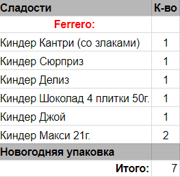 Киндер Шоколад 4 плитки 50 гр. (1 шт), Киндер Делиз (1 шт), Киндер Сюрприз (1 шт), Киндер Кантри (со злаками) (1 шт), Киндер Макси 21 гр. (2 шт), Киндер Джой (1 шт)