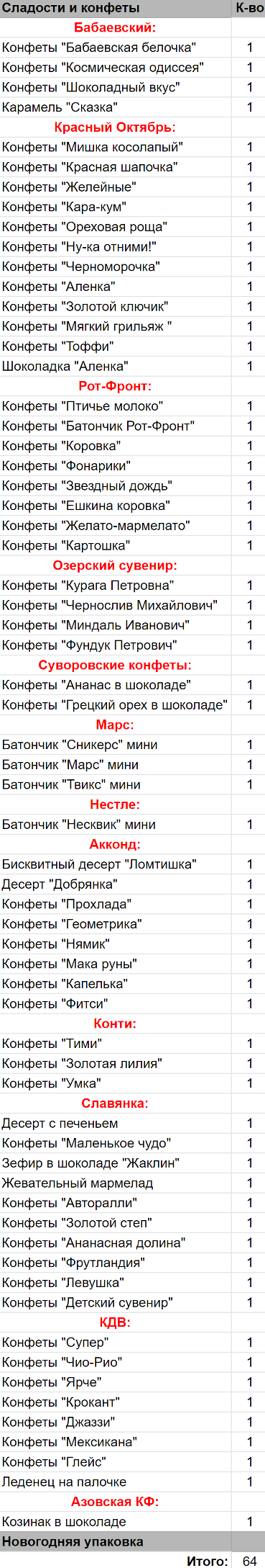 Интернет-магазин сладких новогодних подарков работает от производителя напрямую, за счет чего мы убираем посредников и снижаем цены на детские новогодние подарки. Кроме того, наша логистика позволяет доставить заказ практически в любой город за наш счет. Все цены на сладкие подарки актуальны