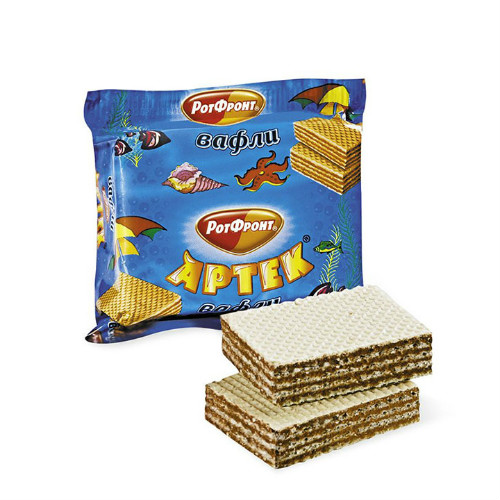 Вафли Артек 75 грамм производства Рот Фронт можно купить оптом с доставкой по Москве, Подмосковью и ЦФО. Низкая цена обусловлена отсутствием посредников при наличии прямого договора с производителем.  Все актуальные сертификаты в наличии. Минимальный заказ: 1 коробка